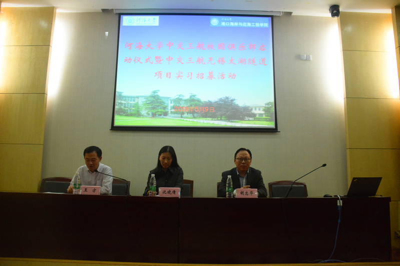 5月9日晚上6:30在河海大学闻天馆113举办了河海大学中交三航局校园俱乐部启动仪式暨中交三航局无锡太湖隧道项目实习招募活动,出席活动的领导有中交三航局人力资源部副总经理沈晓倩、招聘经理费佳颖、三航局三公司人力资源部经理、无锡太湖隧道项目部书记孟开醒,以及河海大学直播平台 党委书记胡忠华、副书记姜海霞、河海大学就业指导中心主任王方,直播平台 2015级全体学生参加了此次宣讲会。