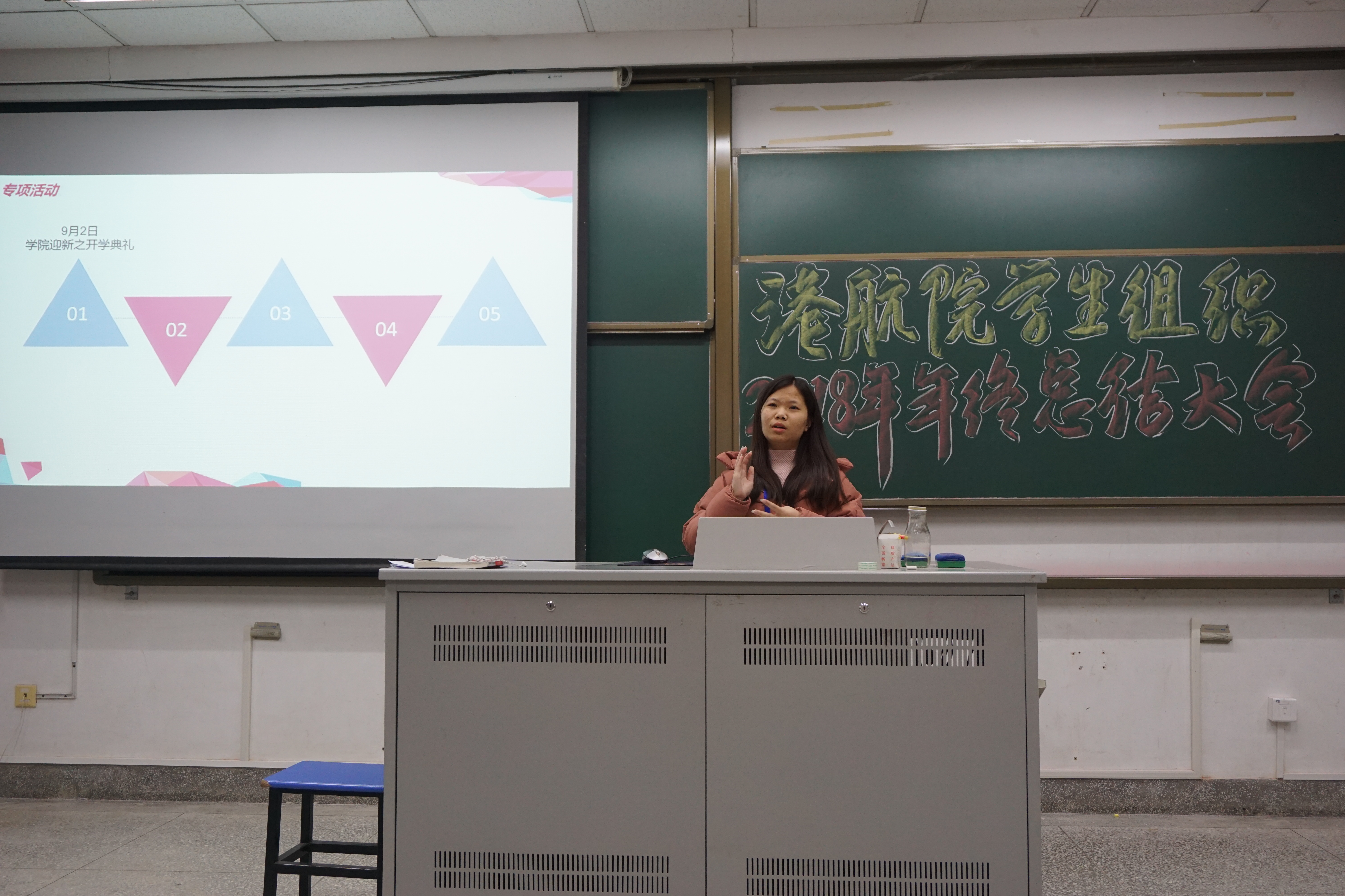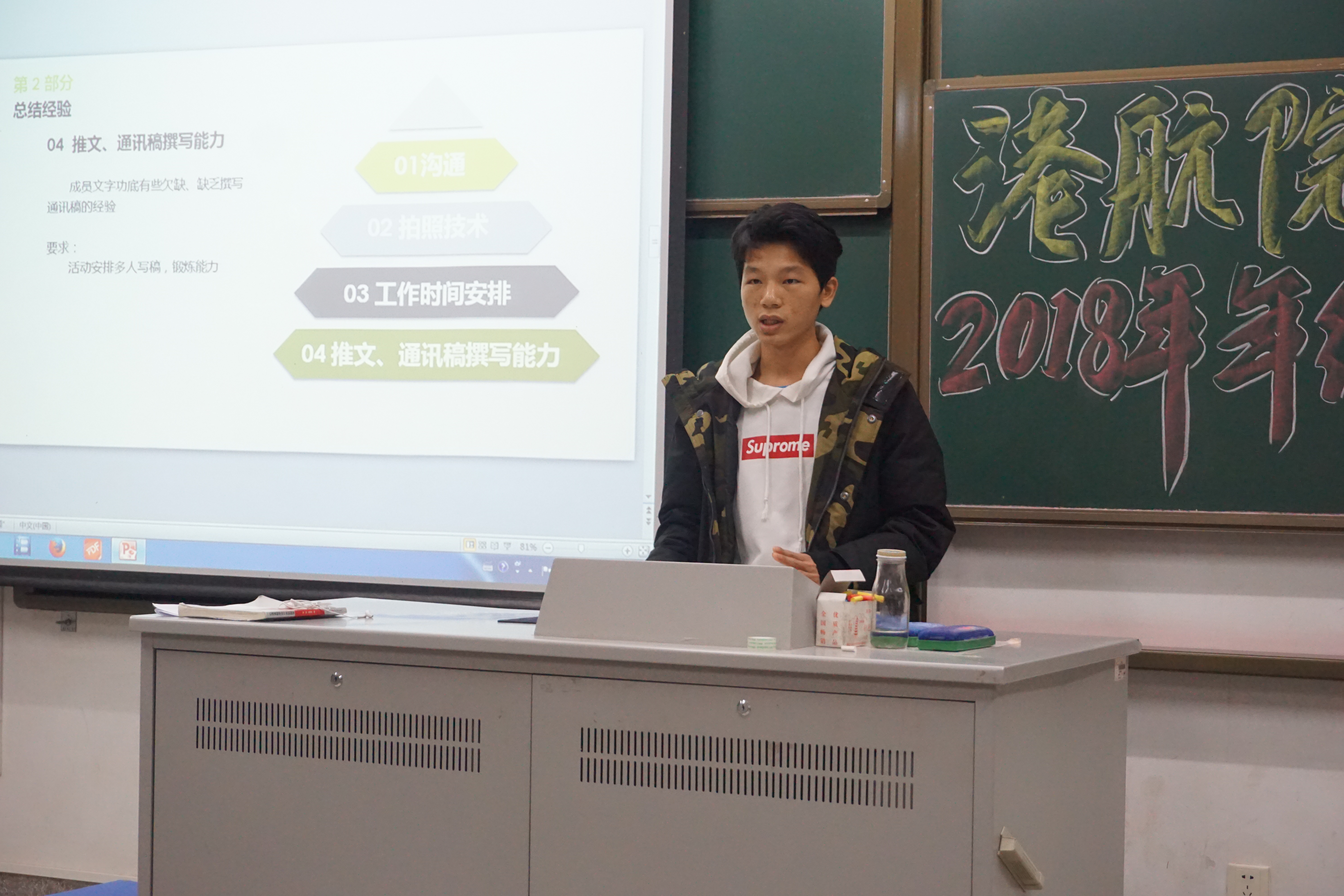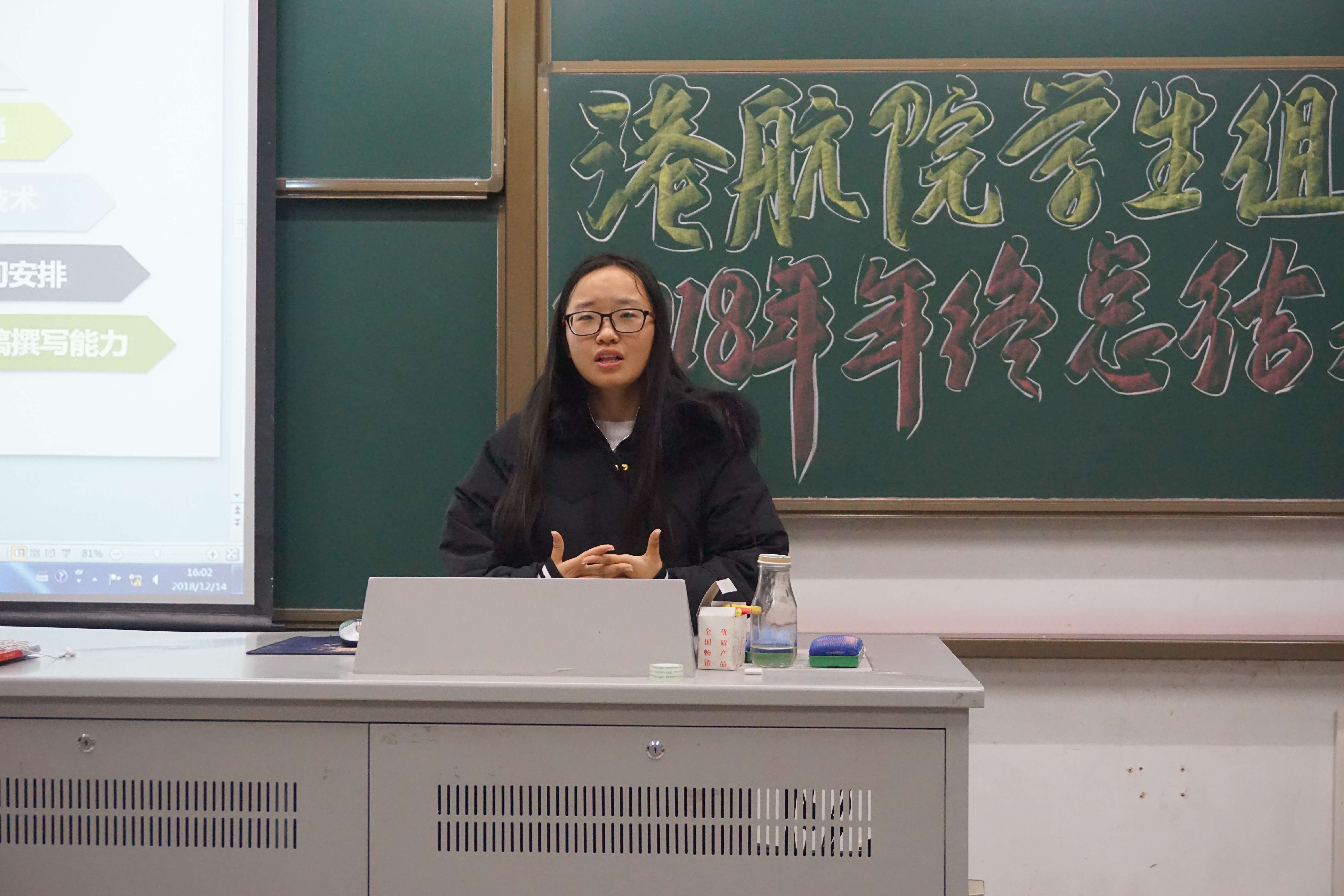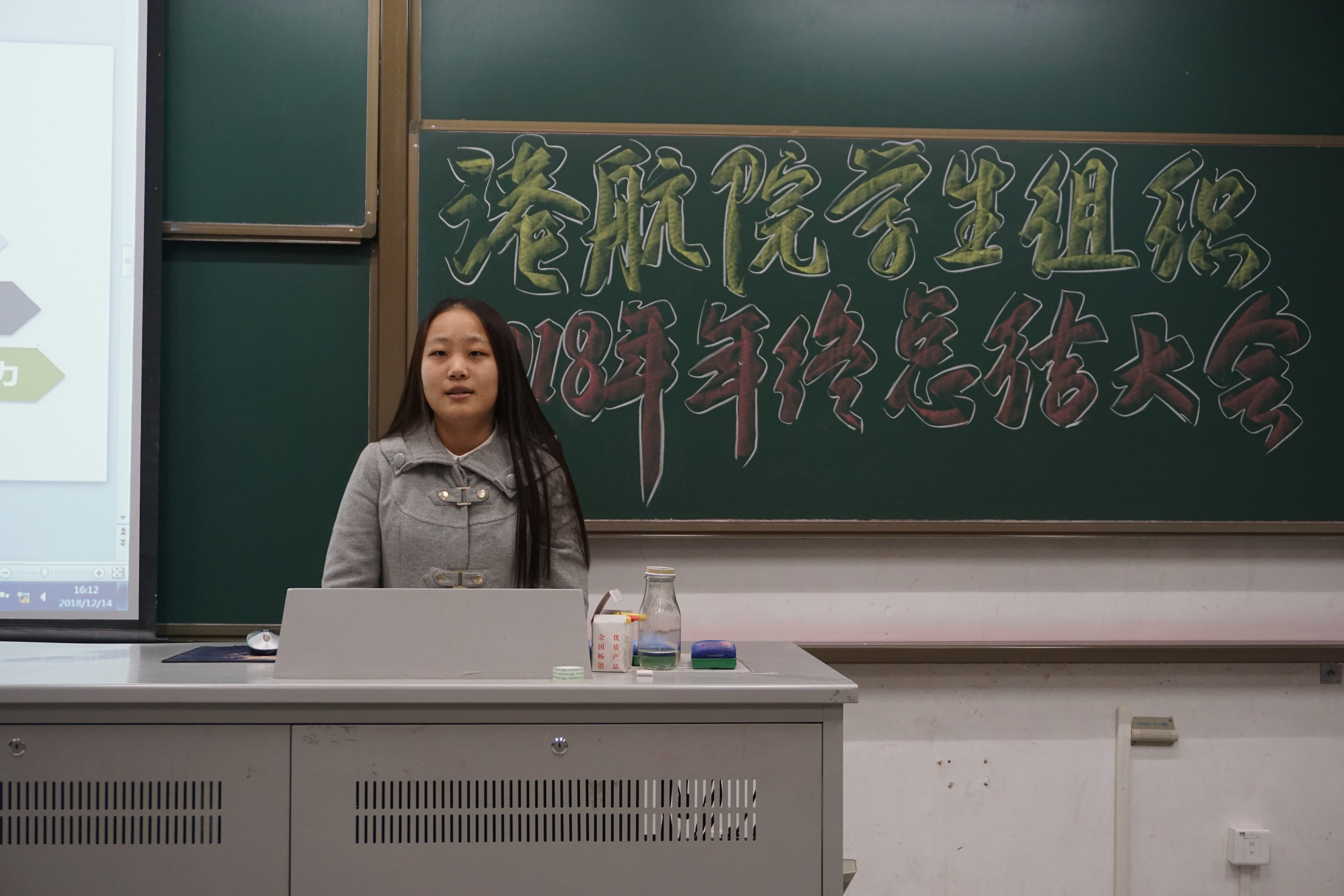 学生会副主席周洁总结了学生会在本学期进行的活动,在完成传统活动“港航杯”篮球赛、校运会志愿服务等工作的基础上,着力弘扬中华优秀传统文化,举办了红枫金秋系列活动之“秋韵”诗词大会,在诗词雅韵中引导同学弘扬和践行社会主义核心价值观,进一步扩大了中华优秀传统文化与主题教育活动的交融。周洁同时汇报了学生会下一个学期的工作计划。