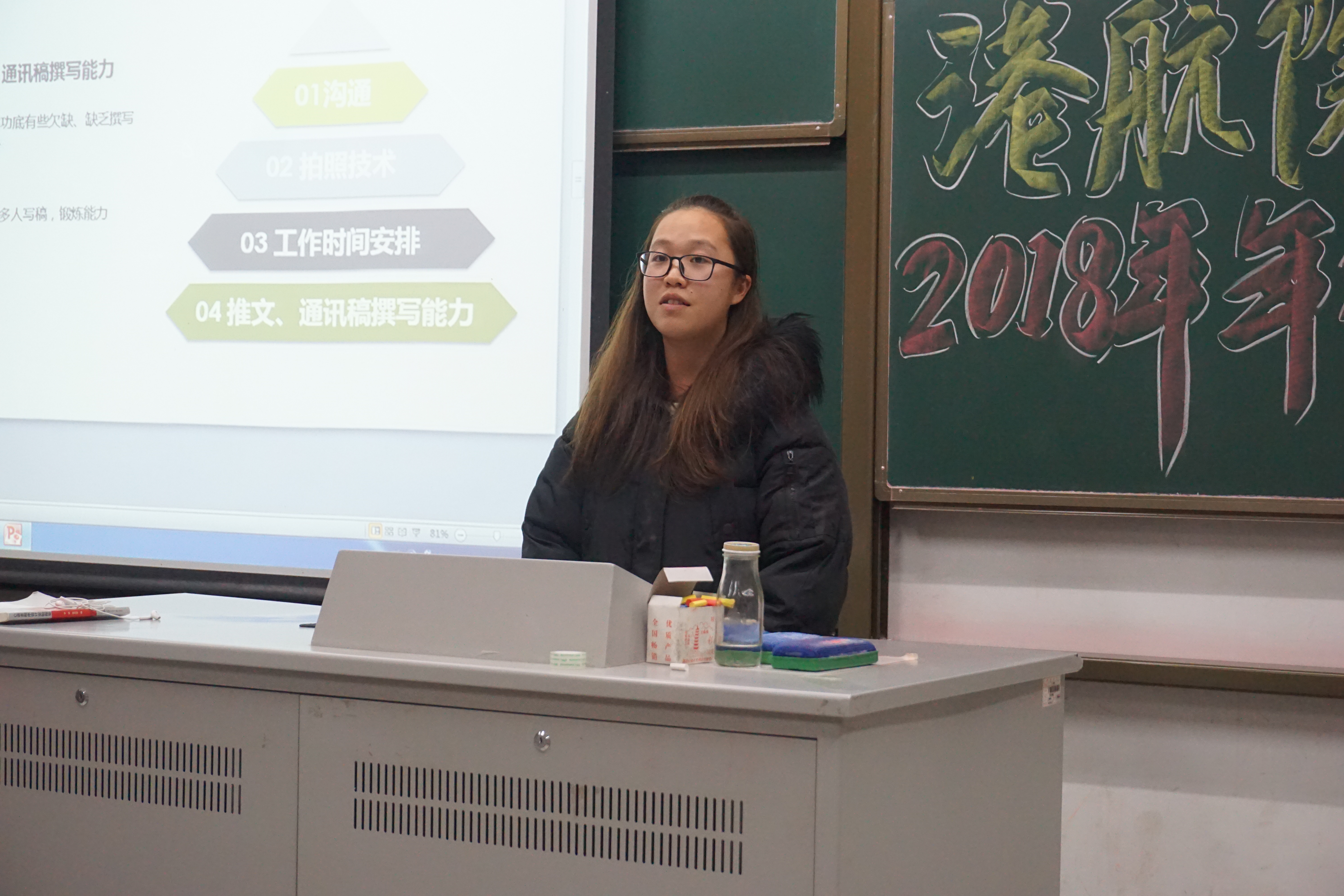 传媒中心的副主任陈自怡首先对传媒中心的各期活动以及日常工作进行汇报,她强调,传媒中心虽然不直接承担大型活动的策划和举办工作,但是对接着其他组织各项活动的前期宣传、活动跟踪报道、后期材料总结等工作,需要和各组织之间继续保持良好沟通,大家合力将每一项任务做到完美。陈自怡针对具体的问题总结经验,针对工作中的不足之处,提出了相应的改善方法。