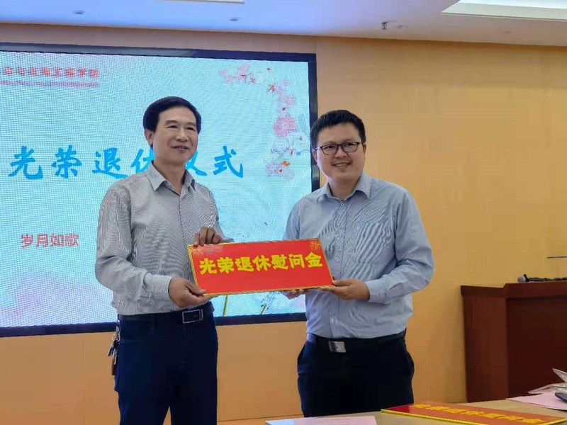 胡忠华书记为丁坚老师、蔡辉老师颁发了光荣退休匾额,陈永平副院长为丁坚老师、蔡辉老师颁发了“光荣退休慰问金”,实验中心教师代表为他们献上了献花。