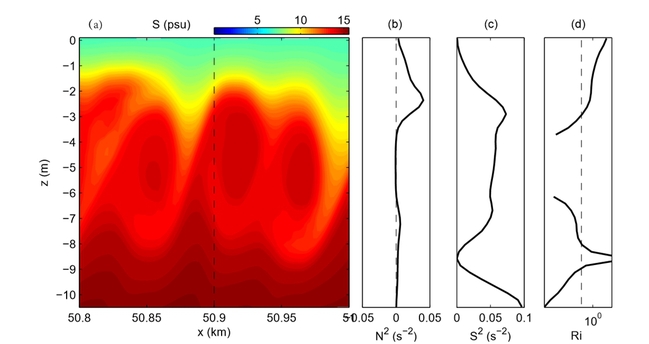 图2.1.5 长江口北槽K-H涡发生时盐度、速度梯度、盐度梯度、理查德森数垂向分布图