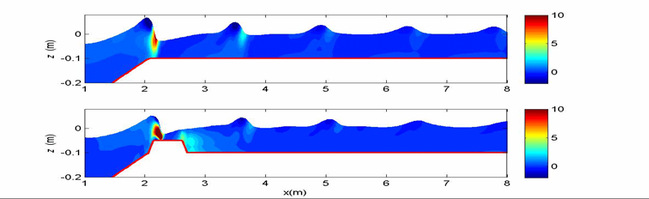 成功复演了珊瑚礁海岸波浪破碎紊动涡流场的时空变化过程,发现礁冠的存在会增强破波能量耗散率达4.5倍。模拟计算捕捉到长江口北槽下段涨急与涨憩之间存在的Kelvin-Helmoltz涡,发现Kelvin-Helmoltz涡会增强垂向紊动并加速盐淡水混合。